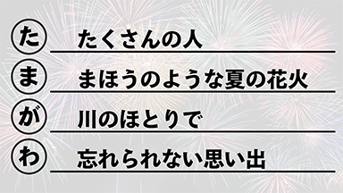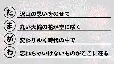 - 多摩川は心のふるさと 末代までもきれいに 輝く空に華やかな花火 わたしたちは、残したい不死身のてっちゃん(65歳)