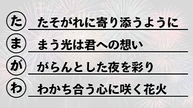 - たくさんの人が一つの空を見上げ まち全体が笑顔に包まれる瞬間。 かけ声や拍手が夜に響き わたしもまた、その輪の中で心が温まるヨーグル(20歳)