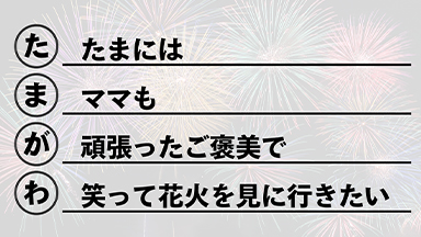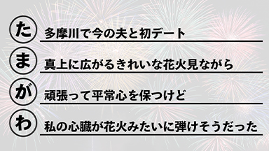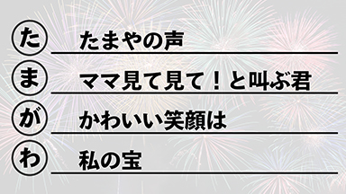 - たまがわで 孫を抱いて見る花火 頑張って生きたご褒美と 笑いながら仰ぎ見るにこたま大好きバァバ(64歳)