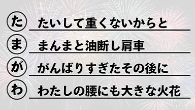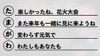 - 田んぼに映る 満開の花火に 感動した 我がふるさとヒヨコ(59歳)