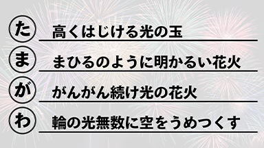 - 高く夜空に舞い上がり 真っ暗な夜空を色で染める 合唱のように響く大歓声 わっと広がる光の波YUM(43歳)